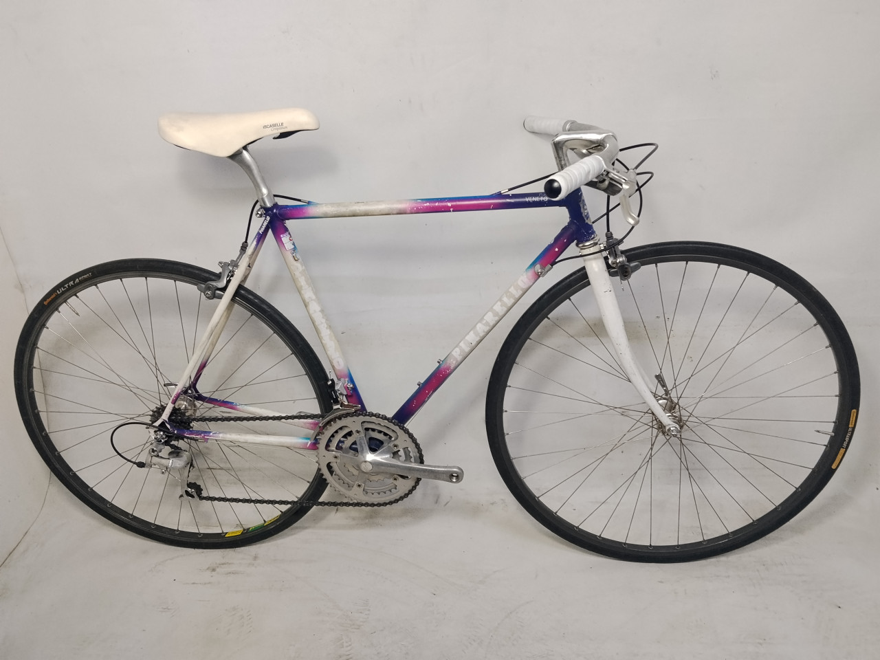 Eladó a képeken látható Pinarello Veneto acélvázas fitness kerékpár. Az ülésvázcső hossza 50 cm (hajtásközép-felsőcső közepe), a felsőcső hossza 52 cm (csőközéptől csőközépig). Felszereltsége: